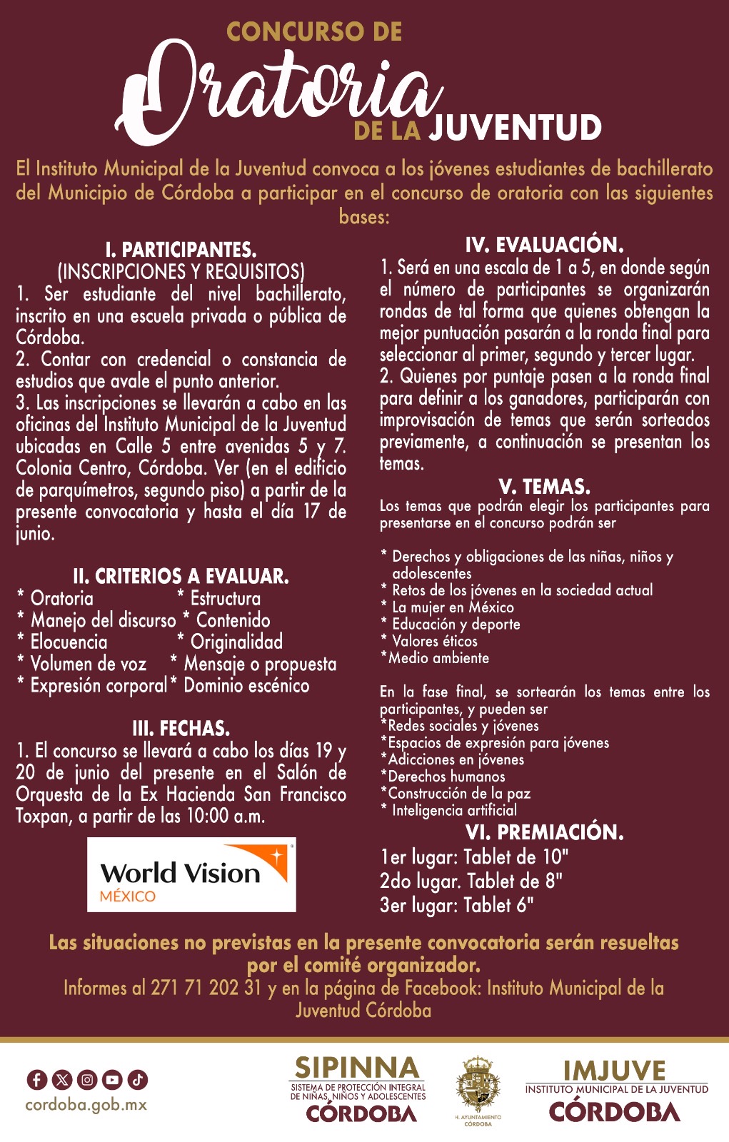 H. Córdoba, Ver. 07 de junio de 2024.- Los jóvenes de Córdoba que cursan preparatoria son convocados a participar en un concurso de oratoria con temas como los derechos y obligaciones de las niñas, niños y adolescentes, retos de los jóvenes en la sociedad actual, adicciones, inteligencia artificial y derechos…