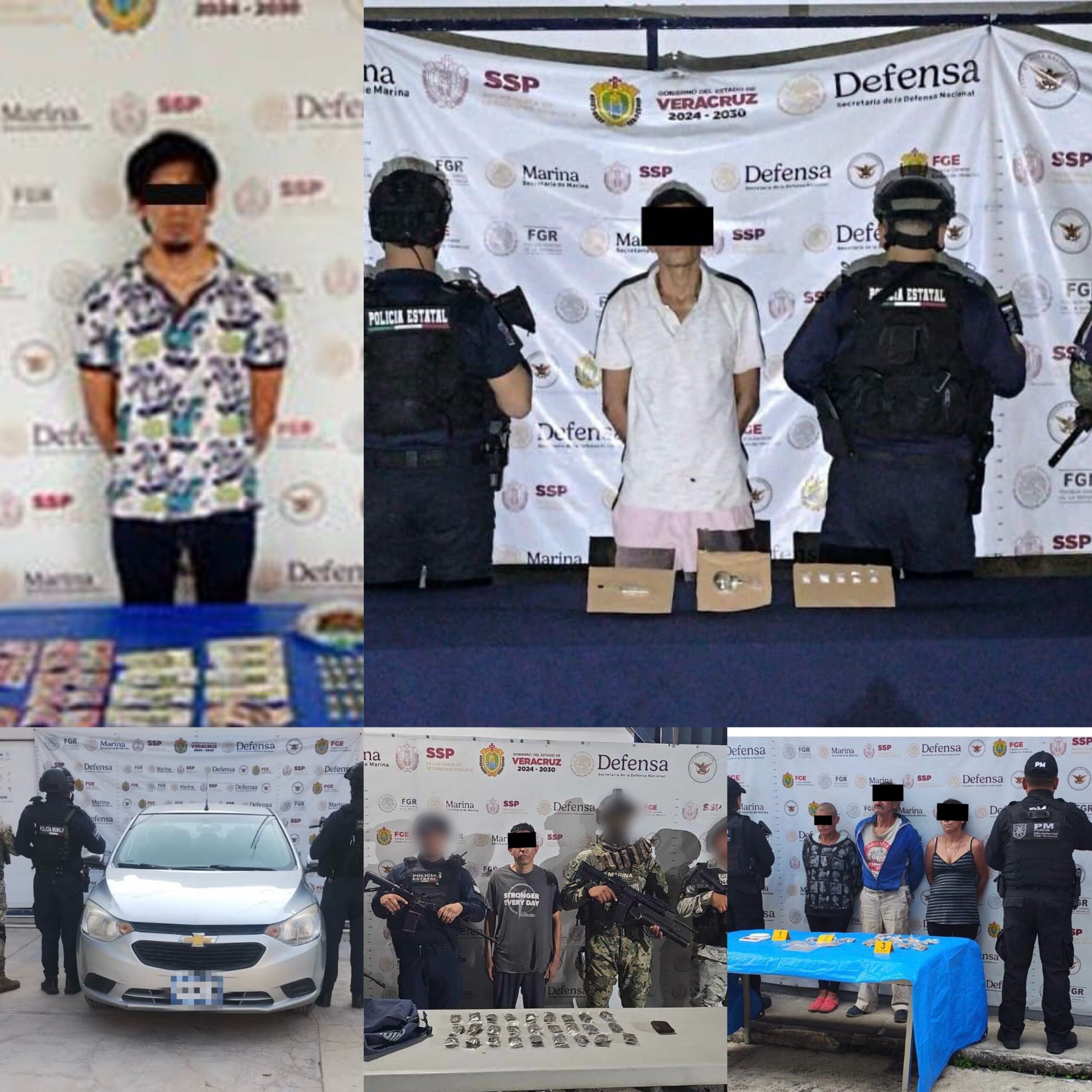 En el marco de la Estrategia de Seguridad Pública del Estado de Veracruz, tres personas fueron detenidas por delitos contra la salud en tres eventos distintos en Veracruz y Río Blanco, asegurándose 13 dosis de sustancia con características del cristal y un vehículo sin reporte de robo. En Coatzacoalcos cinco personas en posesión de 64 dosis de la misma sustancia, además de teléfonos móviles y armas blancas.