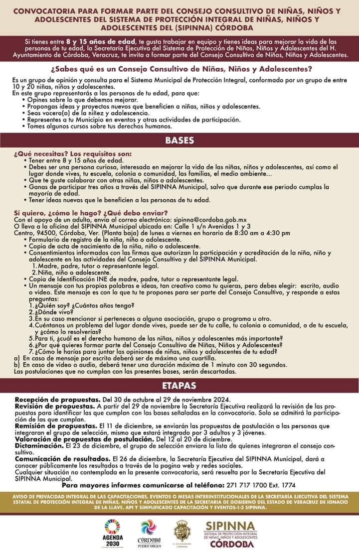 Córdoba, Ver., 29 de octubre de 2024.-El Ayuntamiento de Córdoba a través del Sistema de Protección Integral de Niñas, Niños y Adolescentes (SIPINNA) emitió la Convocatoria dirigida a dirigida a niñas, niños y adolescentes entre 8 y 15 años de edad para integrar el Consejo Consultivo de Córdoba.