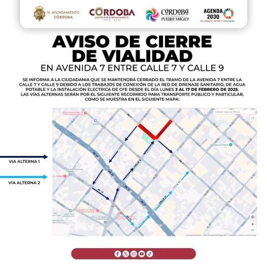 Córdoba, Ver., 31 de enero de 2025.- La dirección de Obras Públicas e Infraestructura Municipal informa a la población que a partir de este lunes 03 de febrero hasta el viernes 17 de febrero se mantendrá cerrado el tramo de la avenida 7 entre la calle 7 y calle 9 esto derivado de los trabajos de Rehabilitación de la obra de la calle 9.